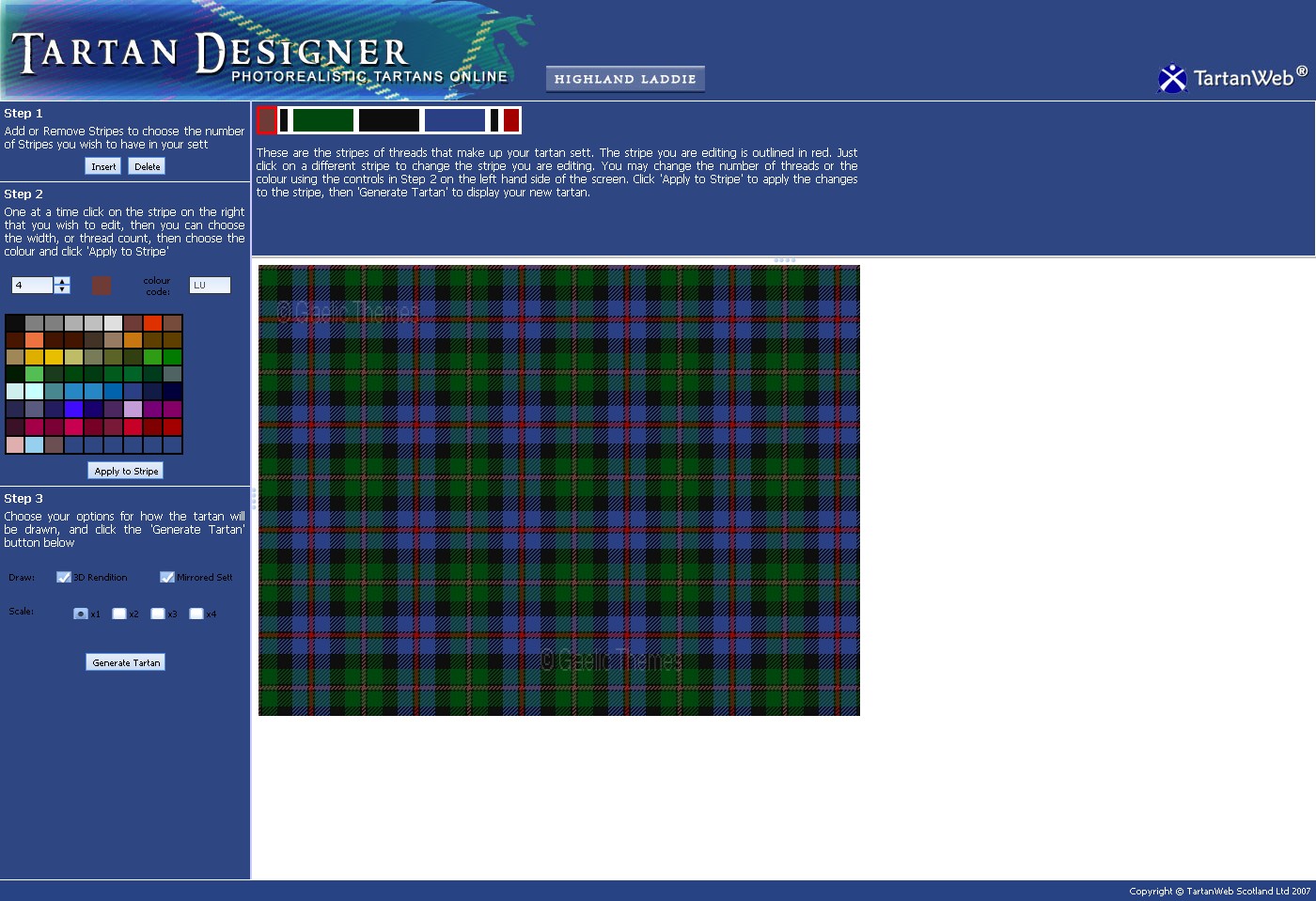 The Tartan Designer is part of the program on http://www.tartanweb.org and includes “Highland Laddie” an interactive clan dress program in which one can see how various items of dress are implemented in the Scottish Clan tradition with a 3-D view of a Higlander. If you enjoy traditional crafts this is a fun program and the Tartan Designer is a useful tool. Enjoy!